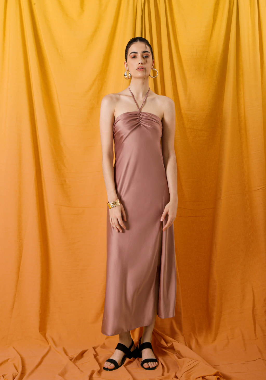 Vestido strapless de saten midi, corte ceñido en cintura que va cediendo más en cadera. La altura del busto se regula con breteles que se atan detras del cuello. Falda recta con abertura frontal desde mitad de pierna.