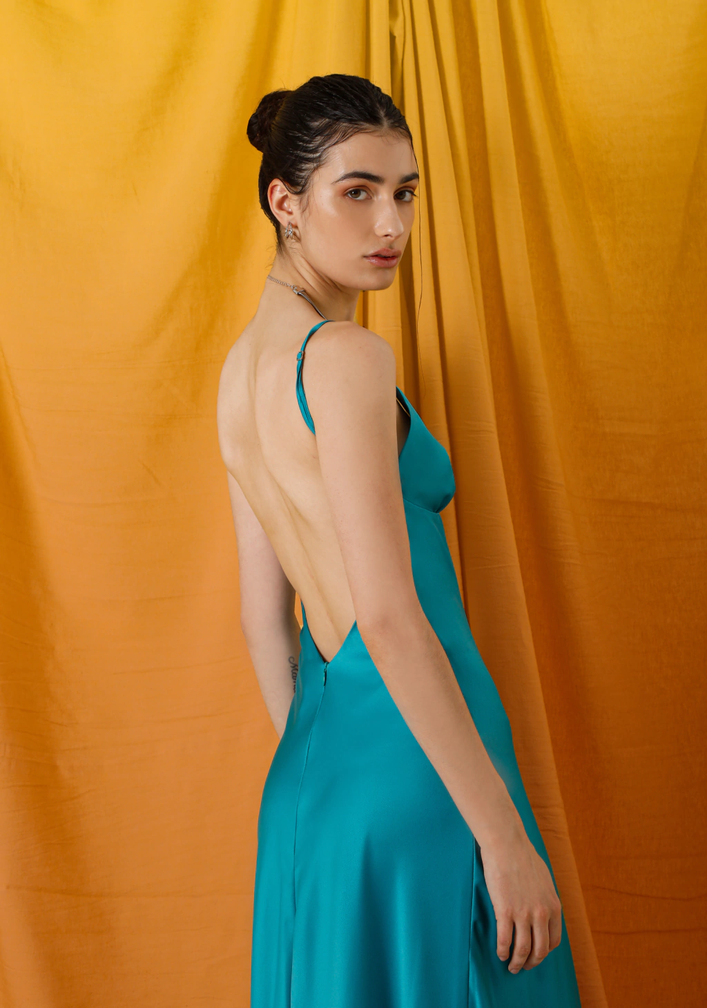 Vestido largo de sedita en un tono verde oliva único . Con un corte princesa que se adapta perfectamente a tu figura, este modelo esta confeccionado al bies, asegurando un calce espectacular. La falda evasé te dará la libertad de movimiento que necesitás, mientras que la espalda descubierta aporta un toque de sensualidad y elegancia.