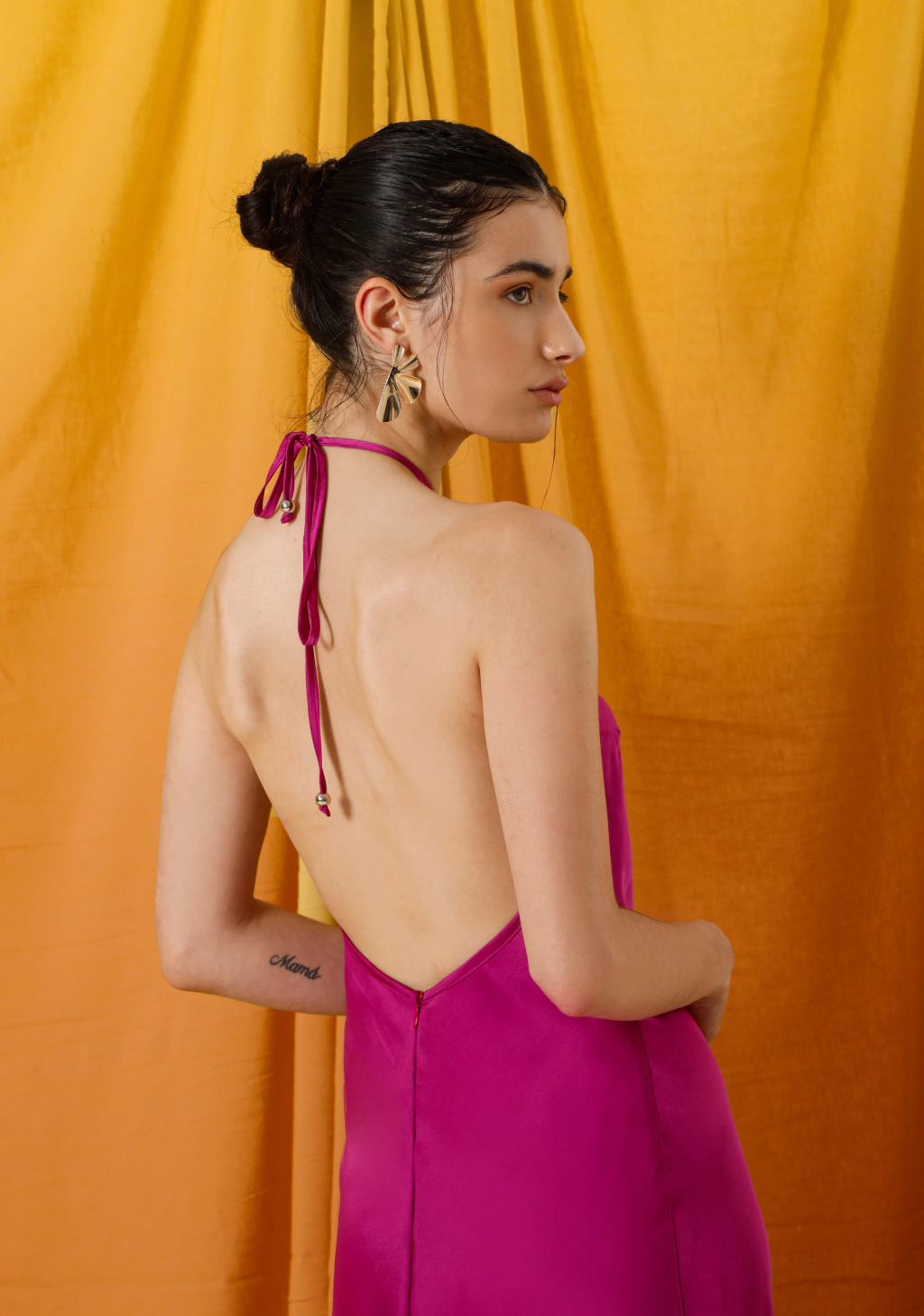 Vestido largo de saten estilo halter con detalle de recorte en busto y espalda descubierta con breteles finos que se atan en cuello. Corte ceñido en cintura que va cediendo más en cadera, con abertura lateral desde parte superior de rodilla.