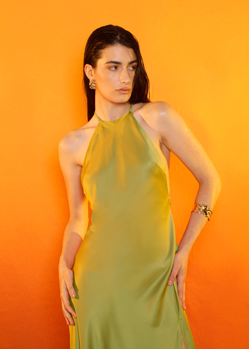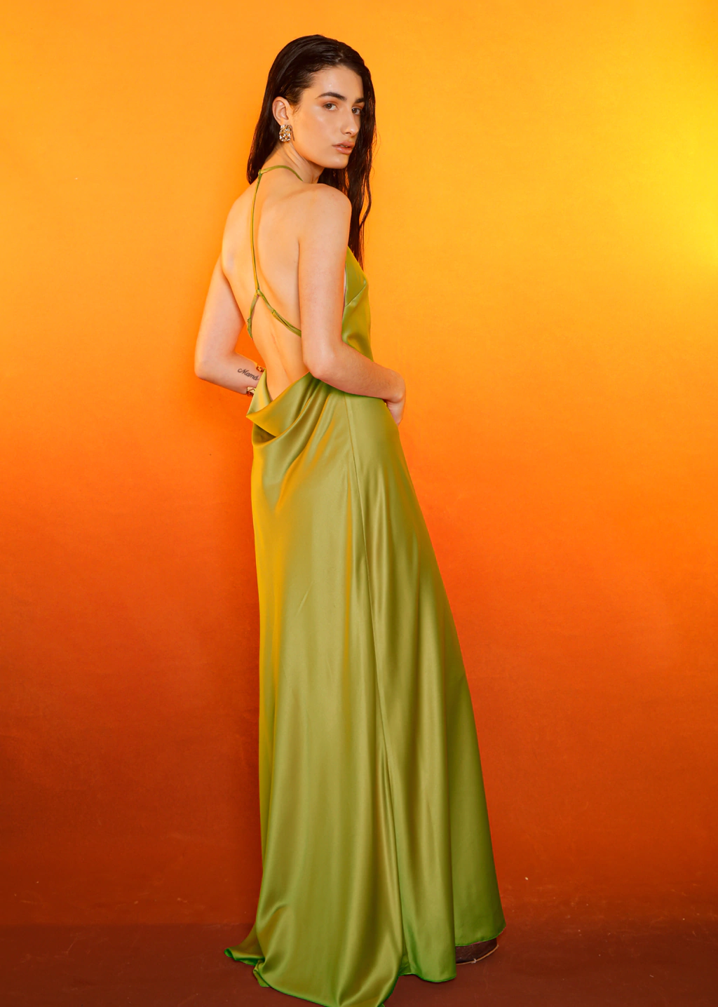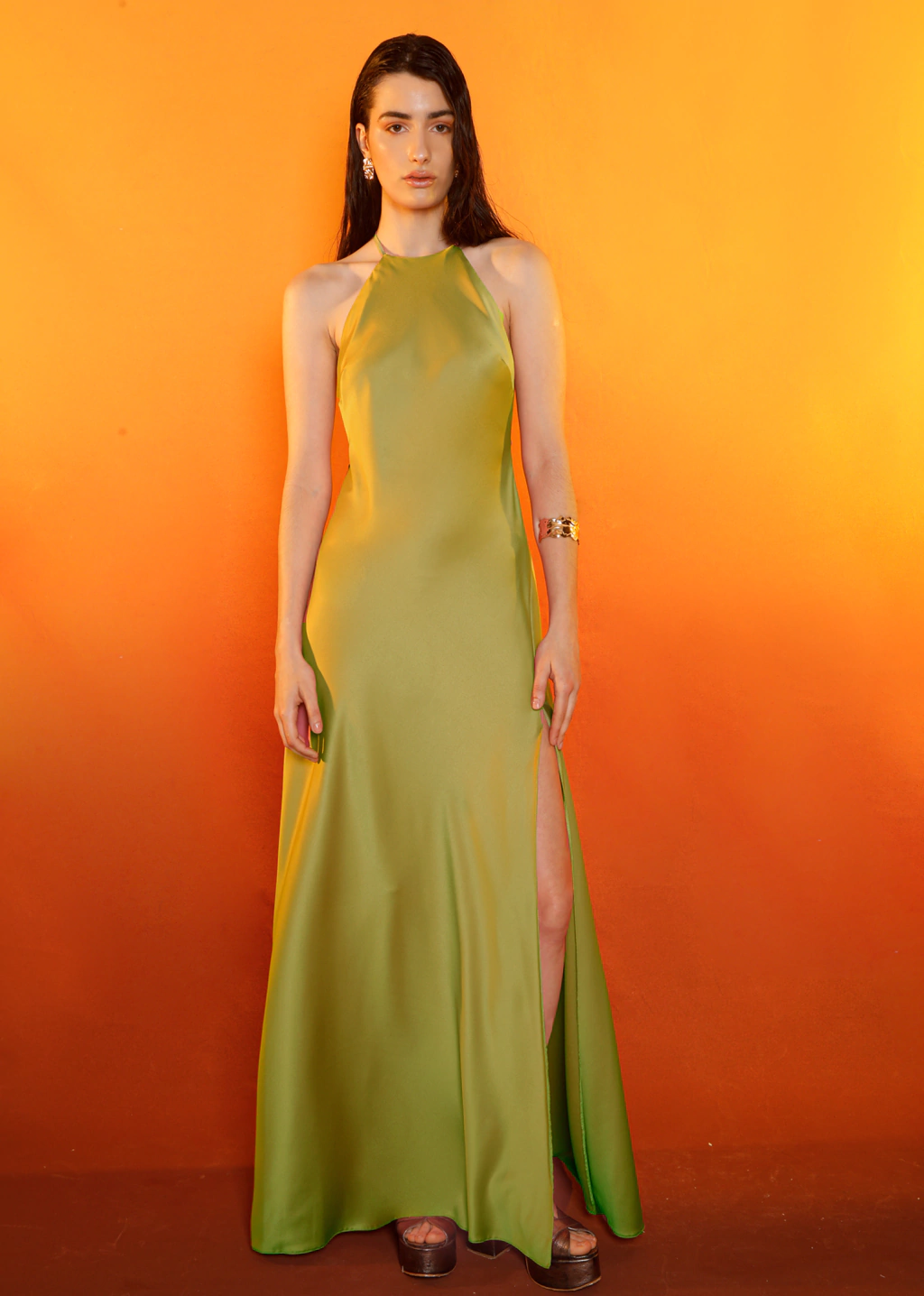 Vestido de saten largo con escote halter. Espalda descubierta con breteles regulables. Calce ceñido en cintura para ceder en cadera. Falda con abertura frontal. Buche en espalda baja.