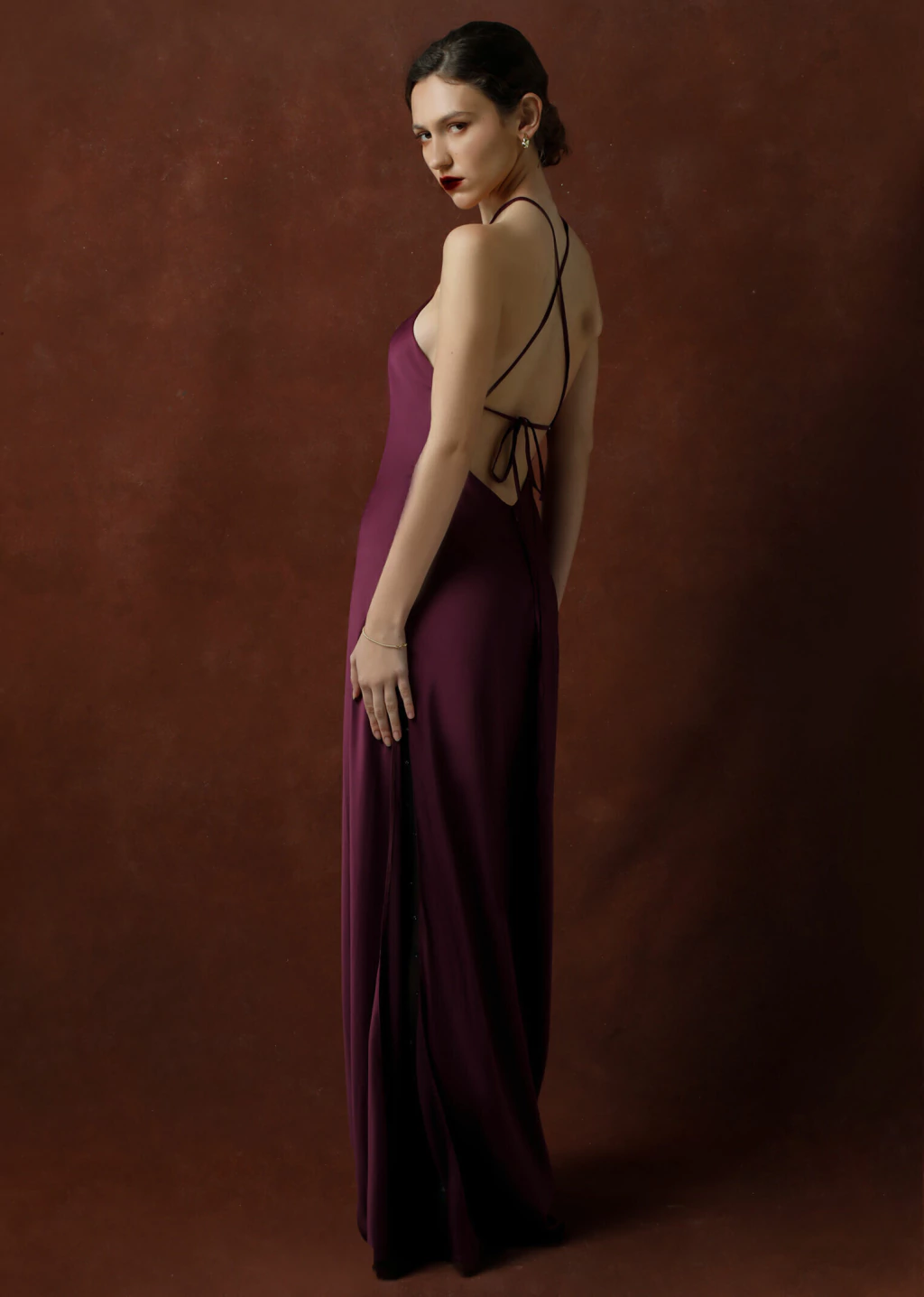 Vestido de sedita largo con escote halter cruzado por delante, anudado por detras. Ajustado en cintura para delinear la silueta, flojo en cadera con abertura lateral. Vestido super elegante y delicado, ideal para eventos formales.